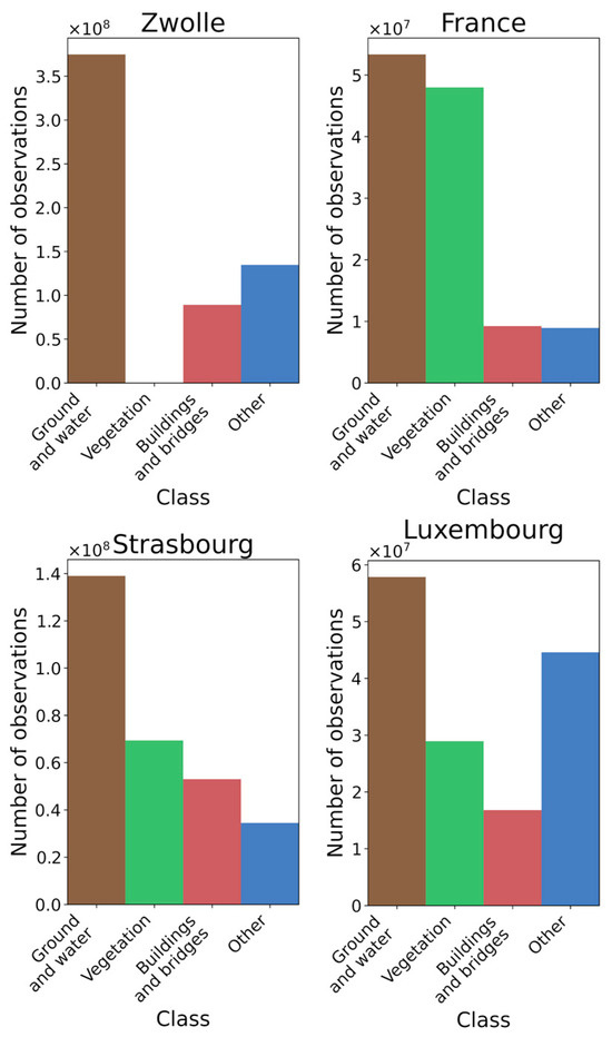In this group, the data from Zwolle, France, Strasbourg, and Luxembourg were selected. The histogram of class occurrences in each dataset is presented in Figure 7.