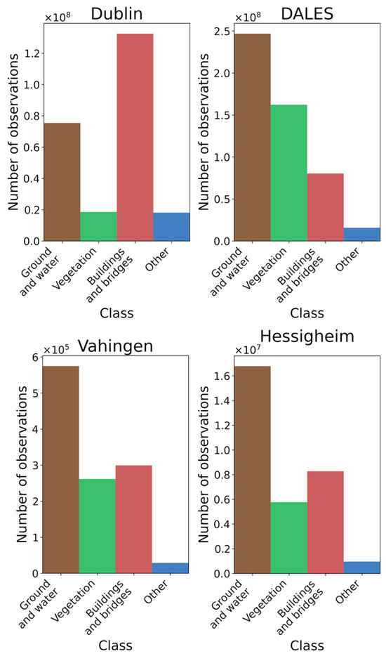 The analysis of the accuracy of the results was also based on four available benchmarking datasets consisting of airborne LiDAR data of Dublin, DALES, Vaihingen, and Hessigheim datasets. The histogram of class occurrences in each of these datasets is presented in Figure 7. The Dublin dataset is an airborne LiDAR point cloud published by the Urban Modelling Group at University College Dublin. The dataset consists of 260 million labelled points that cover an area of 2 km2. More information about the dataset can be found in [54,55]. The DALES dataset was published by the University of Dayton and represents part of the area of British Columbia, Canada [56]. Since the dataset covers a large area, the class distribution is similar to the distribution of classes in country-wise European datasets (Figure 8). The Vaihingen dataset was published by the International Society for Photogrammetry and Remote Sensing and consists of 3 test areas. This dataset has much lower point density than other datasets analyzed in this study. More information about the dataset can be found in [57]. The Hessigheim dataset was published by Institute for Photogrammetry of the University of Stuttgart, ISPRS, and EuroSDR organizations. In this experiment, only the ALS point cloud is used. More information about the dataset can be found in [58]. In the case of benchmarking datasets, some of the classes had to be reassigned to match the set of classes used in this investigation. The details about class reassignment in all datasets can be found in Appendix A.