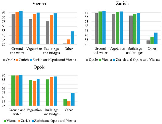 The classification accuracy in the selected datasets is generally high and the errors occur relatively seldom. However, the accuracy of the classification of the Opole dataset is lower than for Zurich and Vienna. Thus, errors in this dataset are more common and may influence all of the classes. At the same time, for Zurich and Vienna, the classification errors mostly affect the ‘other’ class and vegetation. In the case of Opole and Zurich, additional tiles covering surrounding areas were also selected as a part of training and validation sets.