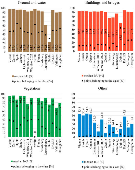 The accuracy of semantic segmentation was evaluated point-wise based on the intersection over union (IoU) calculated using a confusion matrix for each tile of the test and validation datasets. Larger tiles that are characterized by high point density were divided into smaller ones in order to fit to the GPU memory. Then, the median value of each statistic was calculated for each dataset (separately for Vienna, Zwolle, Hessigheim, etc.). Moreover, a mean and a standard deviation were calculated. To enable an easier comparison of the achieved accuracy with other publications, the sensitivity, precision, and F1 score are presented in Appendix B.