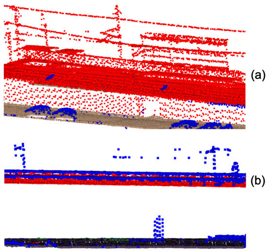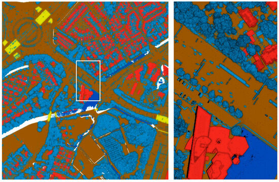 The Zwolle dataset is a part of the AHN4 dataset collected for the whole Netherlands. The accuracy of the classification is high and the errors occur very seldom. This dataset could not be used for the training stage because it lacks a vegetation class—the vegetation points are classified into the unclassified (other) class. However, based on this dataset, it is possible to evaluate the accuracy of the ground and water and buildings and bridges classes.