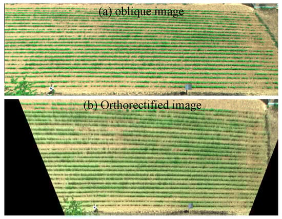 In addition, to correct the oblique shooting angle of the camera, the preprocessed images were orthorectified and projected into UTM coordinates using ground control points distributed throughout the experimental field (Figure 1a). Each control point’s geographic coordinate was paired with its corresponding pixel location in the image to compute a geometric transformation function. The corrected orthorectified images are shown in Figure 3.