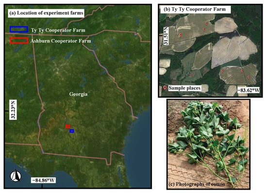 (a) Map showing the location of the two experiment farms near Tifton, Georgia, USA. (b) Sampling places of Ty Ty Cooperator Farm in 2019. (c) Image of a cotton plant from the farm.