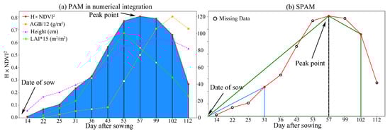 Examples of PAM-series cumulative values used for AGB modeling. The red line shows the VI2 · H curve derived from NDVI of soybean. (a) PAM numerically integrates the curve to obtain cumulative values. The unfilled data points represent interpolated measured data. (b) SPAM calculates the area of triangles before the peak point, e.g., the blue triangle represents the cumulative value of the fourth image, and calculates the area of quadrangles after the peak point, e.g., the green quadrangle corresponds to the results of the 10th image. The peak point is defined as the time at which the curve reaches its maximum.