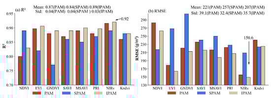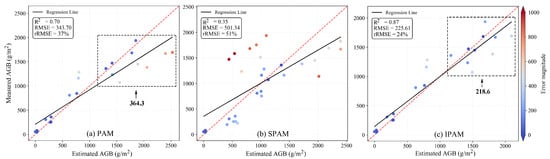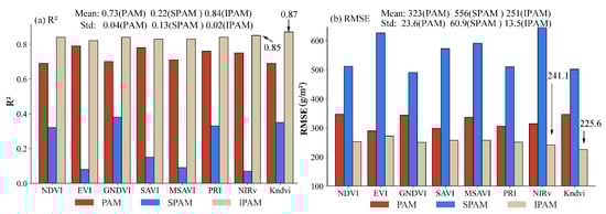 Figure 8a and Figure 8b are the statistical results of and RMSE, respectively. Figure 8a reveals that the values for the AGB estimations of the three models are positive across all indices, with mean values of 0.87 and 0.84 for PAM and SPAM, which are lower than that of 0.89 for IPAM. Similarly, the RMSE statistics (Figure 8b) mirror this ranking of model performance. The mean value of the RMSE for IPAM is 207 g/m2, which is lower than that of 221 g/m2 and 257 g/m2 for PAM and SPAM. In particular, NIRv demonstrates the most accurate estimation results for PAM and IPAM, particularly for IPAM, with an of 0.92 and an RMSE of 150.6 g/m2. It is worth noting that although NDVI is theoretically linked to chlorophyll content and net assimilation rate, its practical performance is often limited by saturation effects, nonlinear responses, and background sensitivity [39]. These limitations may explain why NDVI-based models exhibit higher RMSE values compared to NIRv and Kndvi, which are specifically designed to mitigate such issues.