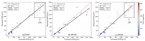 AGB scatter plot of Kndvi for cotton based on the three models. (a) PAM, (b) SPAM, and (c) IPAM.