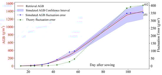 Soybean deviation analysis of simulated and theoretical AGB. The red curve represents AGB derived using real NIRv and height data. The blue and green dashed lines show the simulated and theoretical fluctuation errors, respectively. Both are expressed as twice the standard deviation, further adjusted by the CV of . Dashed lines correspond to the right Y-axis, while others refer to the left Y-axis.