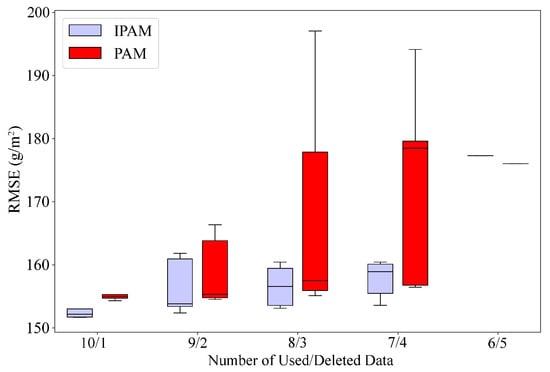Figure 13 presents boxplots that illustrate the data reduction impact on RMSE for PAM and IPAM. The plot reveals that as the amount of data decreases, PAM’s RMSE increases slightly faster than IPAM’s and exhibits much higher variability, especially when three or four data points are removed. Furthermore, IPAM consistently achieves a lower RMSE compared to PAM, indicating that data reduction has a smaller impact on IPAM and highlighting its strong stability. Additional statistical analysis indicated that combinations of missing observations involving later growth stages, where the average plant height was higher, had a stronger negative impact on estimation accuracy. This trend is consistent with the IPAM integration mechanism, which emphasizes the contribution of high values to cumulative AGB estimation.