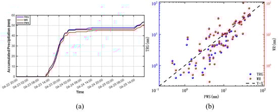 Figure 2a shows the temporal evolution of cumulative minute-level precipitation recorded by the PWS, WR, and TRG instruments. The three time series exhibit a consistent overall trend, indicating good agreement in measurement dynamics.