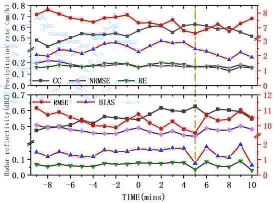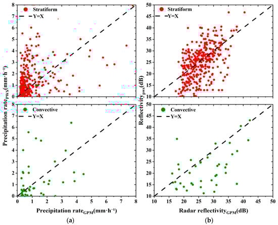 Accordingly, this study adopts the 5 min post-overpass timestamp as the standardized matching time, providing a robust temporal reference framework for subsequent evaluation of GPM product retrieval accuracy and the development of reflectivity correction algorithms. All further analyses in this study are based on data matched at this representative time point, and statistical metrics introduced earlier were employed to quantitatively assess the agreement and error characteristics between satellite and ground observations.