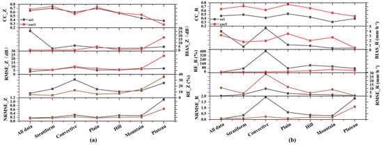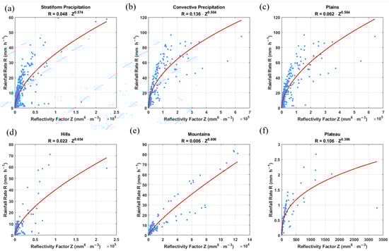 b under various classification models. Specifically, panels (a) and (b) represent the stratiform and convective precipitation models, respectively; panels (c) and (d) correspond to precipitation models for plains and hilly areas; and panels (e) and (f) show the models for mountainous and plateau regions.