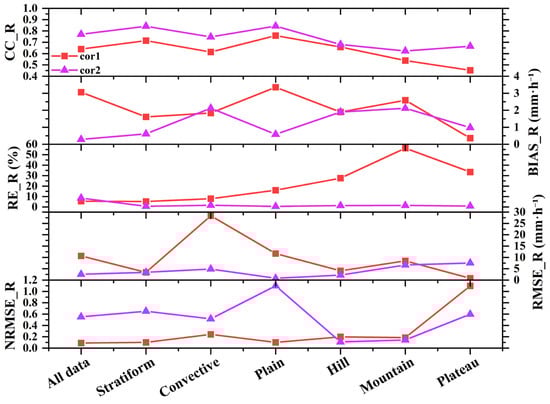 The mean bias (MB) also shows marked improvements. For instance, in plateau regions, MB reduces from 2.59 mm∙h−1 to 2.12 mm∙h−1, suggesting partial correction of overestimation caused by ice-phase scattering processes. However, a slight systematic overestimation remains, particularly in marginal zones. Conversely, in hilly regions, a persistent underestimation exists, with bias magnitude slightly increasing from −0.36 mm∙h−1 to −0.98 mm∙h−1, and RE remaining relatively high (33.45% vs. 0.84%), highlighting ongoing challenges in complex terrain. Lastly, normalized RMSE (NRMSE) values further confirm enhanced stability and accuracy of retrievals. For example, in representative terrains, NRMSE decreases from as high as 0.24 (cor1) down to approximately 0.10 (cor2), demonstrating improved relative error control across different precipitation and terrain conditions.