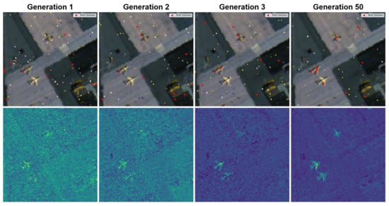 This figure illustrates the evolutionary refinement of hyperspectral target spectra over generations. The top row shows RGB visualizations of SanDiego2 in the SanDiego1 → SanDiego2 adaptation benchmark, while the bottom row presents detection maps. Candidate solutions are color coded. In Generation 1, the best solution (red) only has a single pixel on one of the target airplanes. By Generation 2 and Generation 3, this improves to two and three pixels, respectively. By Generation 50, six of the ten pixels in the best solution have landed across all three airplanes, yielding the detection map with the clearest target delineation.