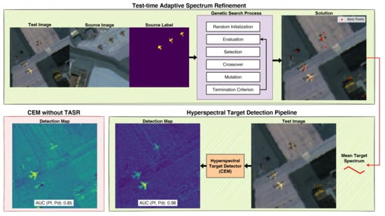 The diagram presents an overview of our TASR framework, which refines target spectra at test time by selecting pixels that optimize the fitness objective. This refined mean spectrum is then used for hyperspectral target detection. Conventional methods rely on source-labeled spectra without adapting to the test scene, making them vulnerable to spectral variability. TASR overcomes this limitation, achieving an of 0.98 compared to 0.85 on SanDiego1→SanDiego2.