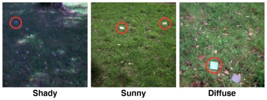 RGB composites of the SSD dataset under three illumination conditions: under-illuminated target in shaded environment (shady), over-illuminated targets in direct sunlight (sunny), and evenly illuminated target with a spectral decoy (diffuse). Red circles indicate target locations.