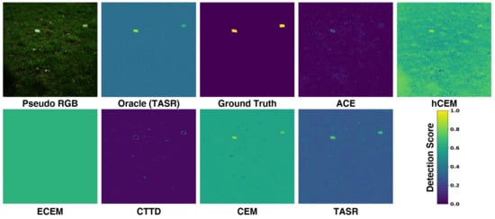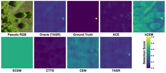 Benchmarks of hyperspectral target detectors on ShadySunnyDiffuse. Arrow values () indicate the change from the respective Oracle, where the Oracle extracts the target spectrum directly from the test scene (i.e., no target spectrum shift). Green indicates performance improvement over the Oracle, while red indicates degradation.