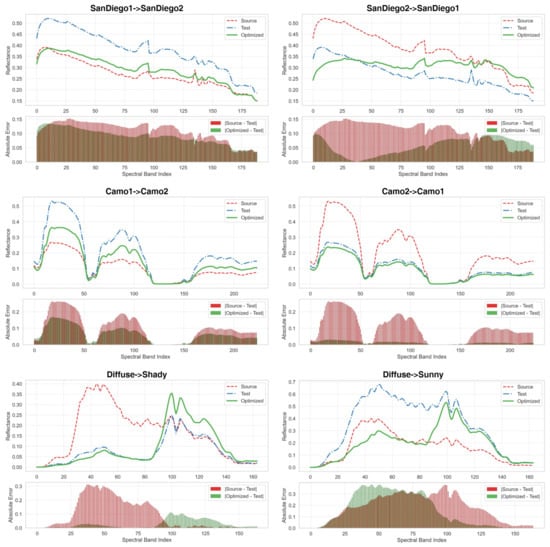 Spectrum quality improvements across datasets. We report MAE, MSE, and cosine similarity for the source and optimized spectra with respect to the true test spectrum. The final column indicates the relative change (%) from the source to the optimized spectrum; positive values represent improvements and negative values indicate degradation. Arrow values () indicate whether higher or lower values are better.