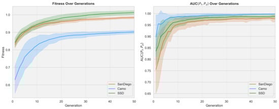 Left: Fitness over generations. Right: Test-time downstream AUC() across generations. The strong correlation confirms the effectiveness of optimizing fitness as a proxy for final detector effectiveness.
