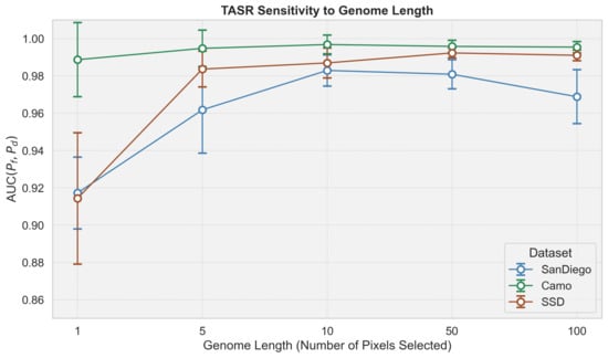 TASR sensitivity to genome length. A very short genome (e.g., 1) lacks expressive power. Increasing genome length improves detection up to a point, but larger values (e.g., 100) can reduce performance due to the increased optimization complexity. A length of 10 provides a good trade-off between accuracy, efficiency, and interpretability.