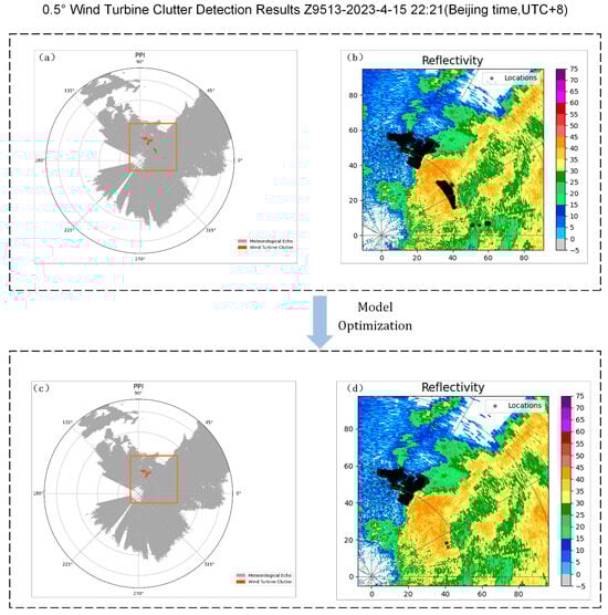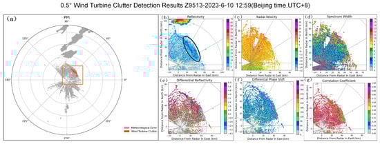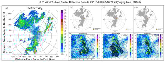 - Case test results indicate that when the WPs encounters large-scale rainfall, the WTC will be almost completely covered by the weather process so that the radar echo data in the covered area are not contaminated by WTC, but the model misdetects. However, we cleverly optimized the model through the correlation coefficient parameter. When conducting individual case tests, we set the samples with a data block mean value of >0.95 in the correlation coefficient channel so that they would not be detected by the model (correlation coefficient of the meteorological echo is >0.95), thereby achieving a more accurate detection effect.