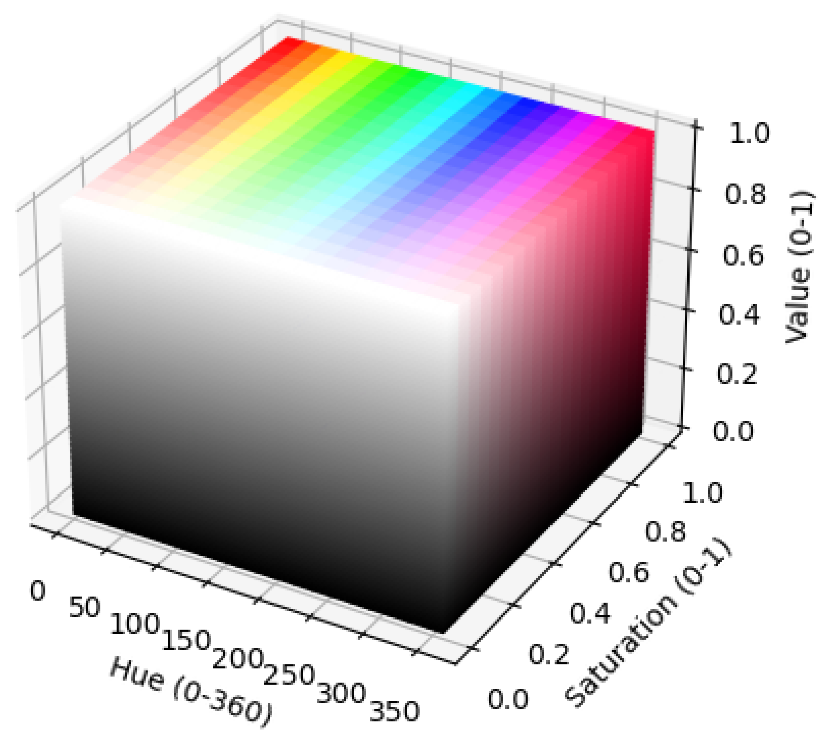 Hue is one of the components in the HSV (or HSB) model (Figure 2), representing the differences in the appearance of colors and quantifying the characteristics of an object’s color. HSV model is converted from the RGB model, and hue is normally represented as an angle ranging from 0° to 360°. We calculated hue using Equation (6) as follows: