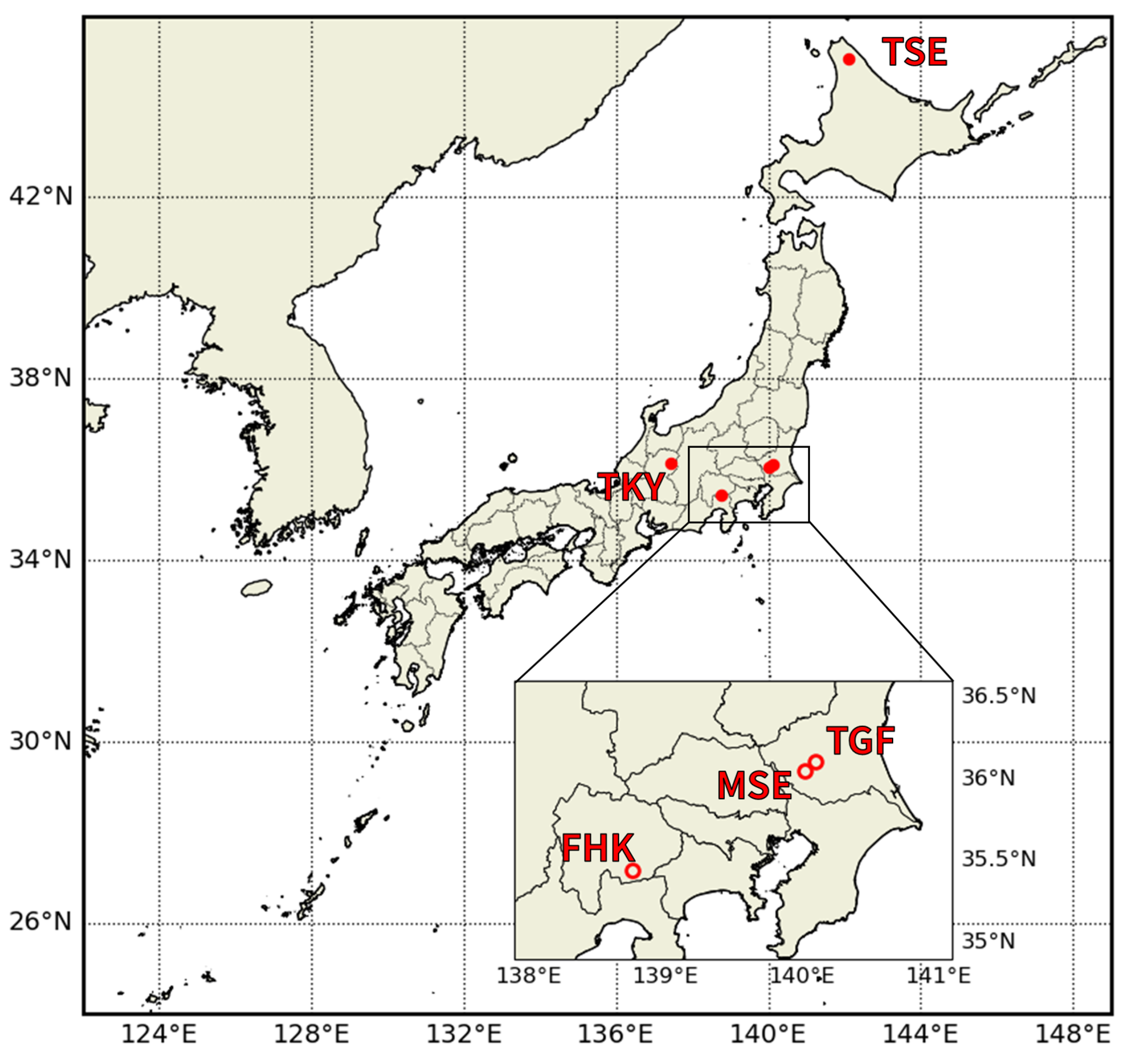 TSE is a sparse deciduous needle-leaved forest (DNF) located in the northern part of Hokkaido. The canopy is primarily composed of young hybrid larch trees (Larix kaempferi × L. gmelinii), while the understory is dominated by dwarf bamboo species, namely Sasa senanensis and S. kurilensis. However, the larch canopy covers less than half of the area, with the remaining area exposed and occupied by dwarf bamboo. The site is frequently covered with snow from November to April. TGF is a 160 m diameter circular grassland consisting of C3 and C4 species located in a diluvial upland. The dominant species are Miscanthus sinensis, Imperata cylindrica, Solidago altissima, and Pueraria lobata subsp. lobata. Mowing is conducted twice yearly (mid-summer and late autumn), and snow is rarely seen in TGF. MSE is a single-crop paddy field to cultivate rice (Oryza sativa L.; Koshihikari), located in the back marsh of Kokai River. Typically, spring plowing is carried out in March or early April. Transplanting, heading, and harvesting occur in early May, late July, and mid-September, respectively. Irrigation starts at the end of April, and mid-season drainage is conducted from June to July. Snow is rarely seen in MSE. TKY is a DBF located on the northwest slope of a volcano (Mt. Norikura). Its canopy species are Quercus crispula, and Betula ermanii with the dwarf bamboo (S. senanensis) in the understory. The area is continuously covered with snow from December to March. FHK is a DNF located on the northern side of a volcano (Mt. Fuji), with the canopy mainly composed of mature larch (L. kaempferi). Other species include Pinus densiflora, Cornus controversa, and Q. crispula. The understory includes ferns (Dryopteris crassirhizoma or D. expansa) and the dwarf bamboo (Sasamorpha borealis). FHK experiences intermittent snow cover from February to March. Topographic effects were not a concern in this study, as all sites were located on flat terrain.