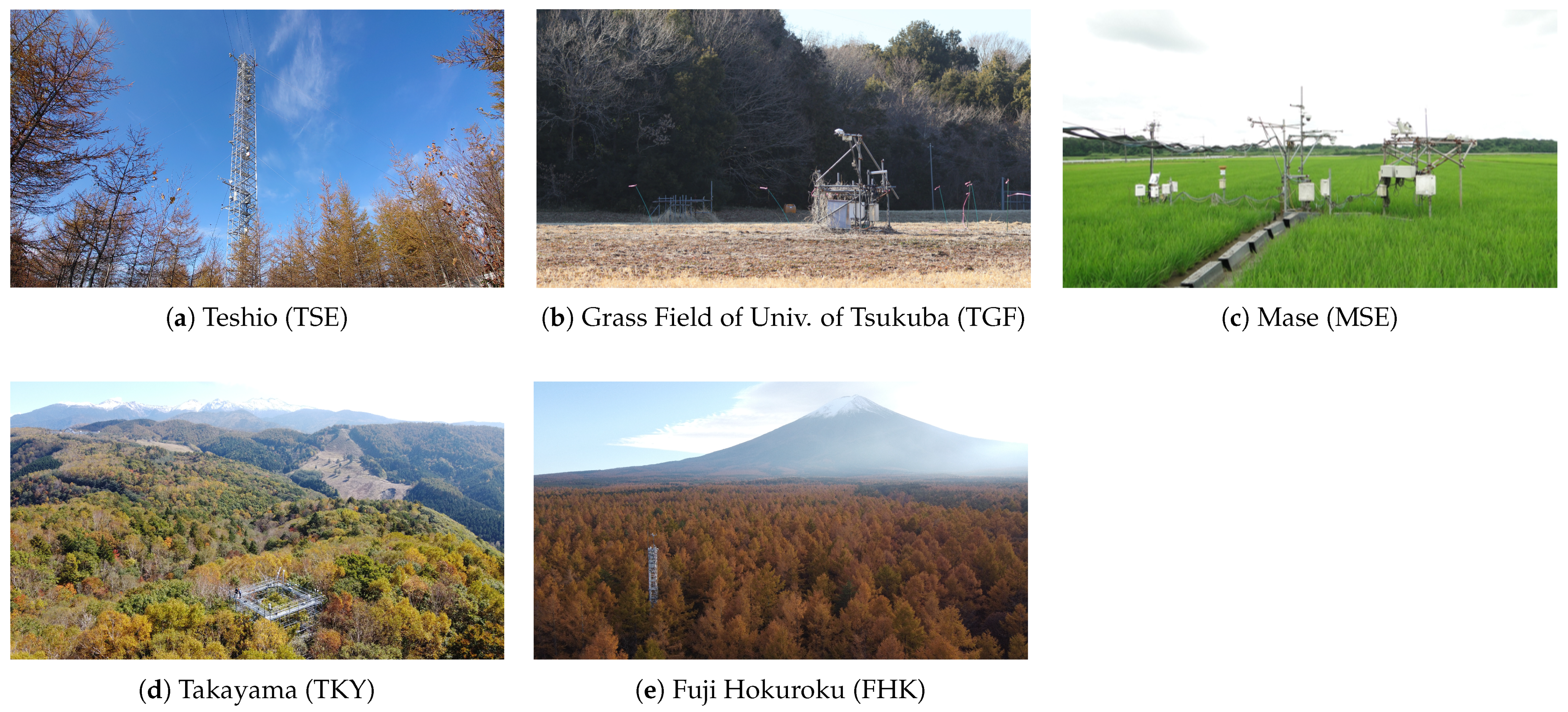 We used five PEN sites in Japan, as shown in Figure 3 and Figure 4, and Table 1 (TSE: Teshio; TGF: Center for Grass Field of Research in Isotopes and Earth Environmental Dynamics (CRiED) in the University of Tsukuba; MSE: Mase; TKY: Takayama; FHK: Fuji Hokuroku), covering four major ecosystems in Japan: deciduous needle-leaved forest: DNF (TSE and FHK); grassland (TGF); rice paddy (MSE); and deciduous broad-leaved forest: DBF (TKY). These sites also belong to AsiaFlux [51] and TSE, MSE, TKY, and FHK belong to the Japan Long Term Ecological Research Network (JaLTER) [52].