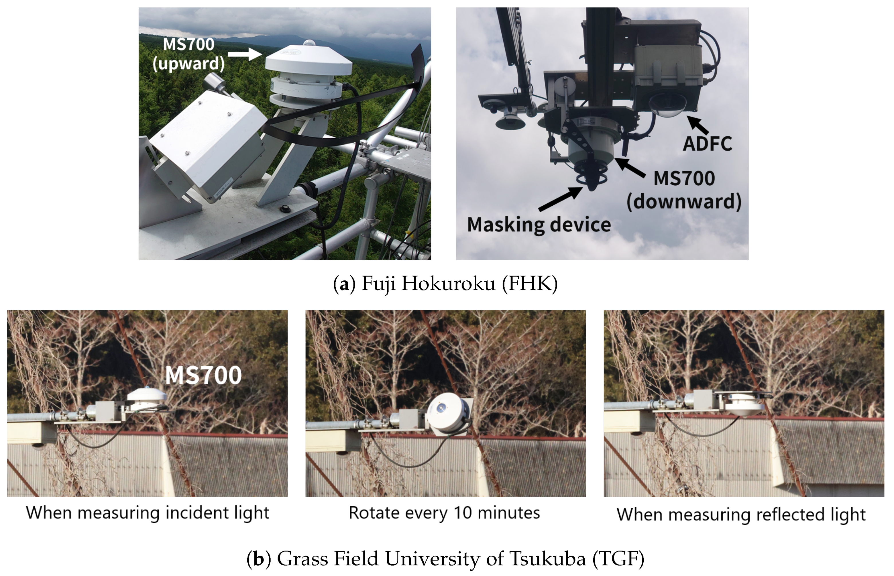 We have been using a hyperspectral radiometer MS-700 (EKO Instrument Co., Ltd., Tokyo, Japan) for HSSR at each site [47,48]. The MS-700 has an observation wavelength range from 350 nm to 1050 nm, with an interval of 3.3 nm. At TSE and FHK, two HSSRs were installed at the top of each observation tower (Figure 5a): one fixed upward to measure incident light from the sky, and the other fixed downward to measure reflected light from the vegetation canopy. Data were collected at 1-min intervals at TSE and 4-min intervals at FHK. At TGF, MSE, and TKY, a single HSSR was installed at the top of the observation towers (Figure 5b), and it flipped up and down by an external motor (CHS-AR, Hayasaka Rikoh Co., Ltd., Hokkaido, Japan), making observation of incident light (sky) and reflected light (vegetation canopy) with a single sensor [47,48]. A single cycle of the observation of the incident and reflected light is 10 min. Therefore, a time gap existed between the measurements of incident and reflected light. To minimize the impact of this gap, the incident light corresponding to each reflected light measurement was estimated as the average of the incident light values obtained immediately before and after the reflected light measurement.