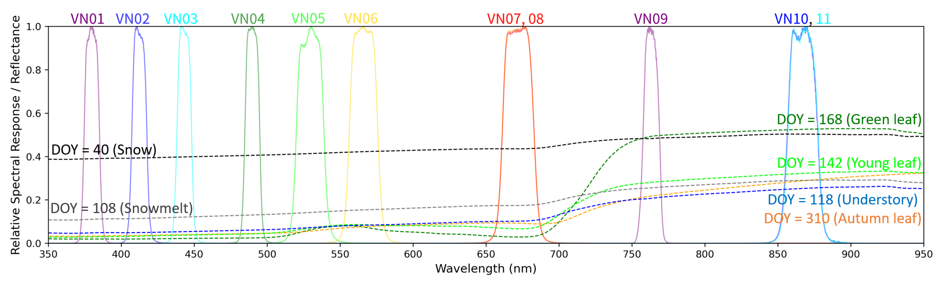 We used HSSR data observed during periods of high solar altitude, specifically from 9:00 to 14:59. The HSSR spectral data were convolved with the relative spectral response (RSR) of GCOM-C/SGLI-VNR (visible and near-infrared radiometer) (Figure 7) to calculate the irradiance for each channel. Furthermore, for each channel, the reflectance was calculated by dividing the canopy irradiance by the sky irradiance. This method is described by the following Equation (1) [54]: