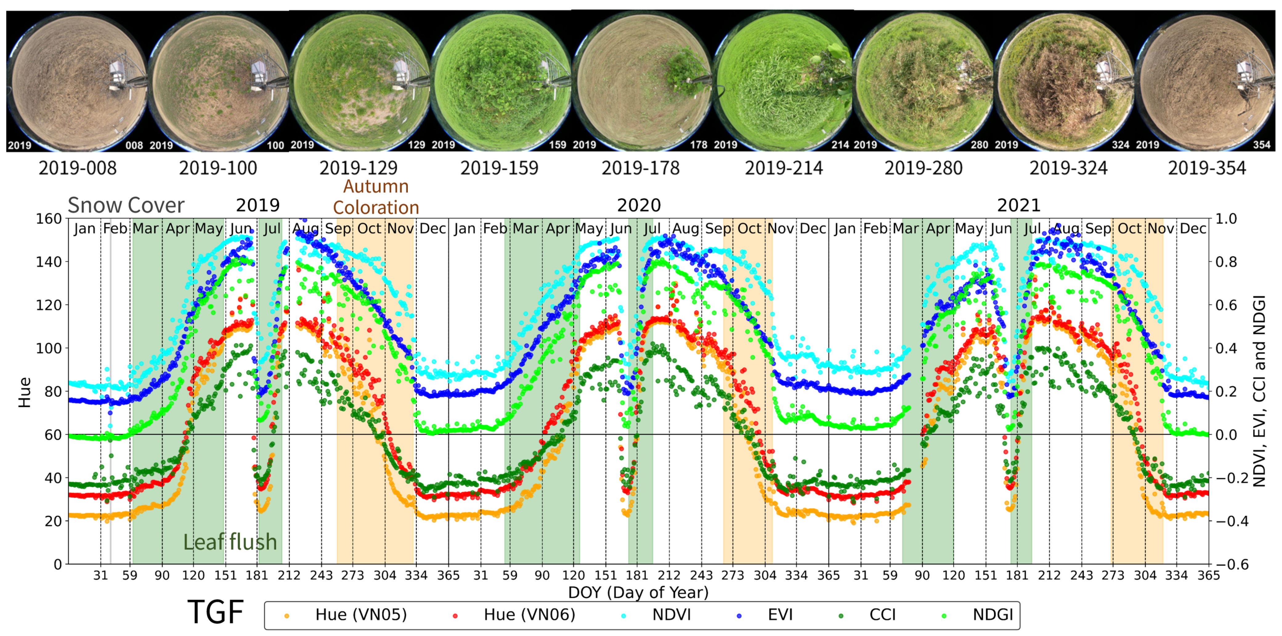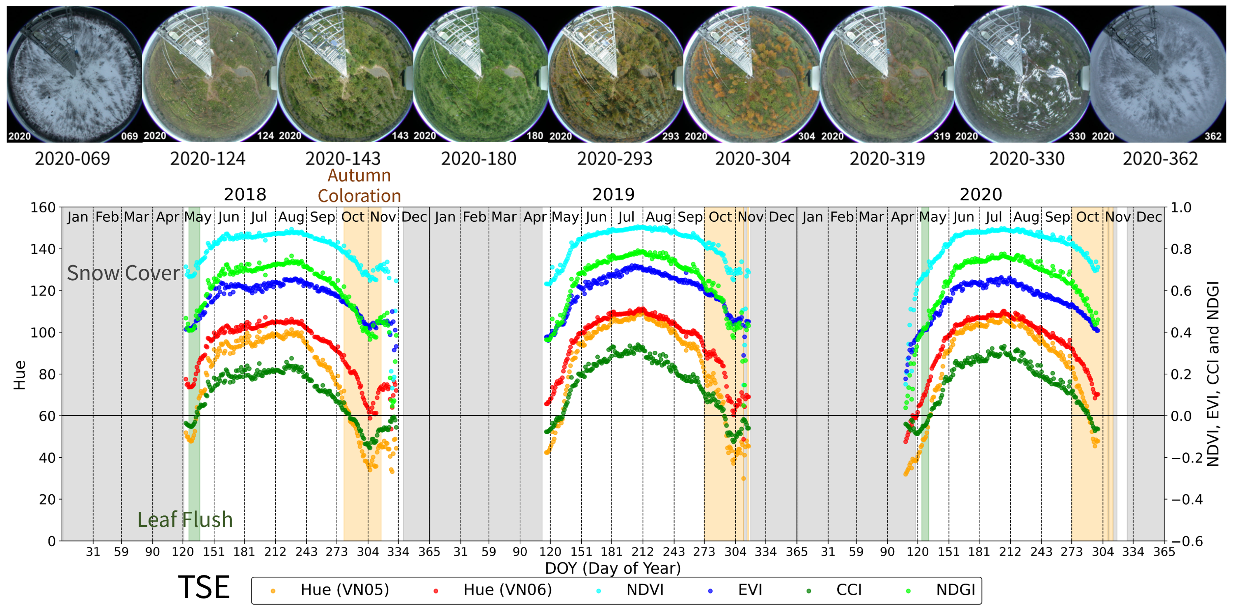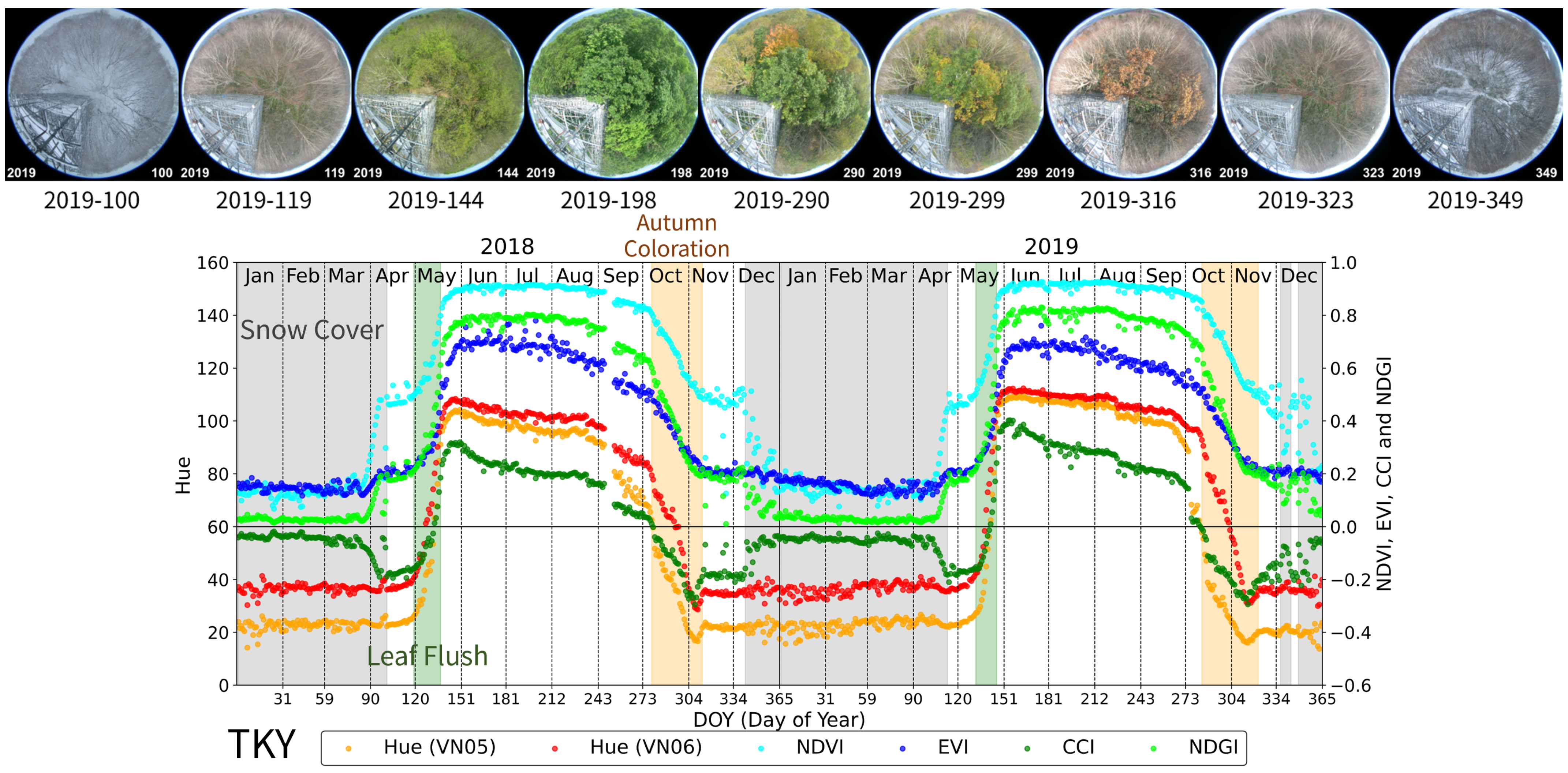 Figure 11. Annual cycle of in situ spectral indices and ADFC images from the Takayama (TKY) deciduous broad-leaved forest (DBF). The images show the typical change. The date of each ADFC image is the bottom number as the “day of year (DOY)”. The graphs show time-series Hue (VN05), Hue (VN06), NDVI, EVI, CCI, and NDGI observed by the HSSR. The gray bands are snow cover periods, the green bands are leaf flush periods, and the orange bands are autumn coloration periods based on visual interpretation from ADFC images.