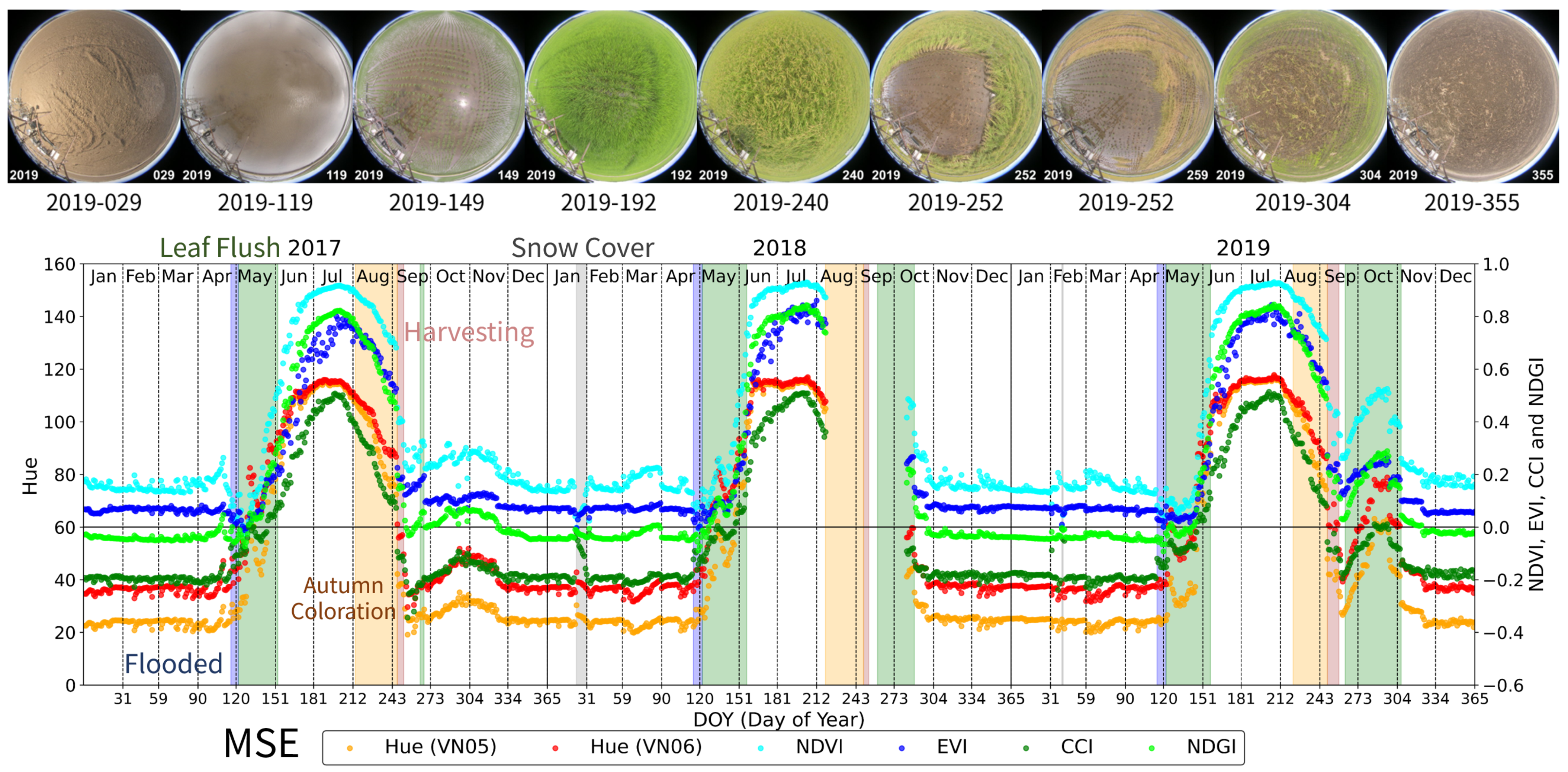 Figure 10. Annual cycle of in situ spectral indices and ADFC images from the Mase (MSE; Rice Paddy). The images show the typical change. The date of each ADFC image is the bottom number as the “day of year (DOY)”. The graphs show time series Hue (VN05), Hue (VN06), NDVI, EVI, CCI, and NDGI observed by the HSSR. The gray bands are snow seasons, the blue bands are flooded periods before planting rice, the green bands are leaf flush periods (including ratoon, rice growth after harvesting), the orange bands are autumn coloration periods, and the pink bands are harvesting season based on visual interpretation from ADFC images.