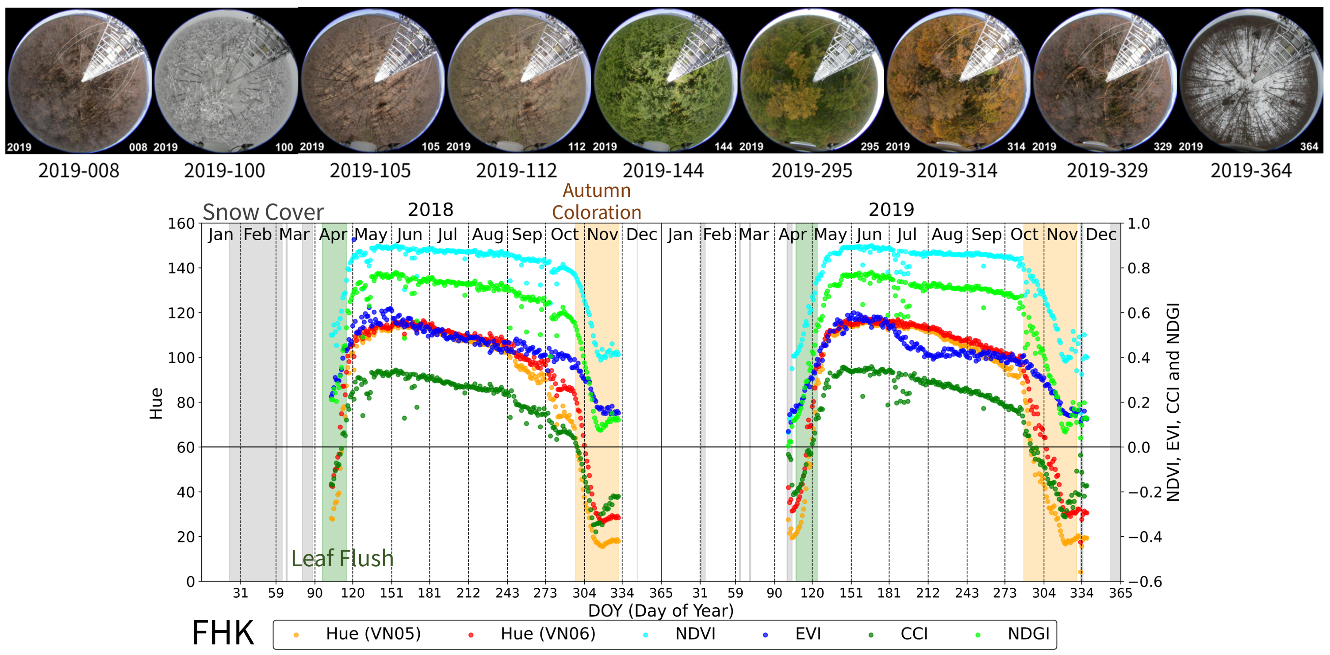 Figure 12. Annual cycle of in situ spectral indices and ADFC images from the Fuji Hokuroku (FHK) deciduous needle-leaved forest (DNF). The images show the typical change. The date of each ADFC image is the bottom number as the “day of year (DOY)”. The graphs show time series Hue (VN05), Hue (VN06), NDVI, EVI, CCI, and NDGI observed by the HSSRs. The gray bands are snow cover periods, the green bands are leaf flush periods, and the orange bands are autumn coloration periods based on visual interpretation from ADFC images. At FHK, HSSRs were removed in winter in order to prevent malfunction due to heavy snow.