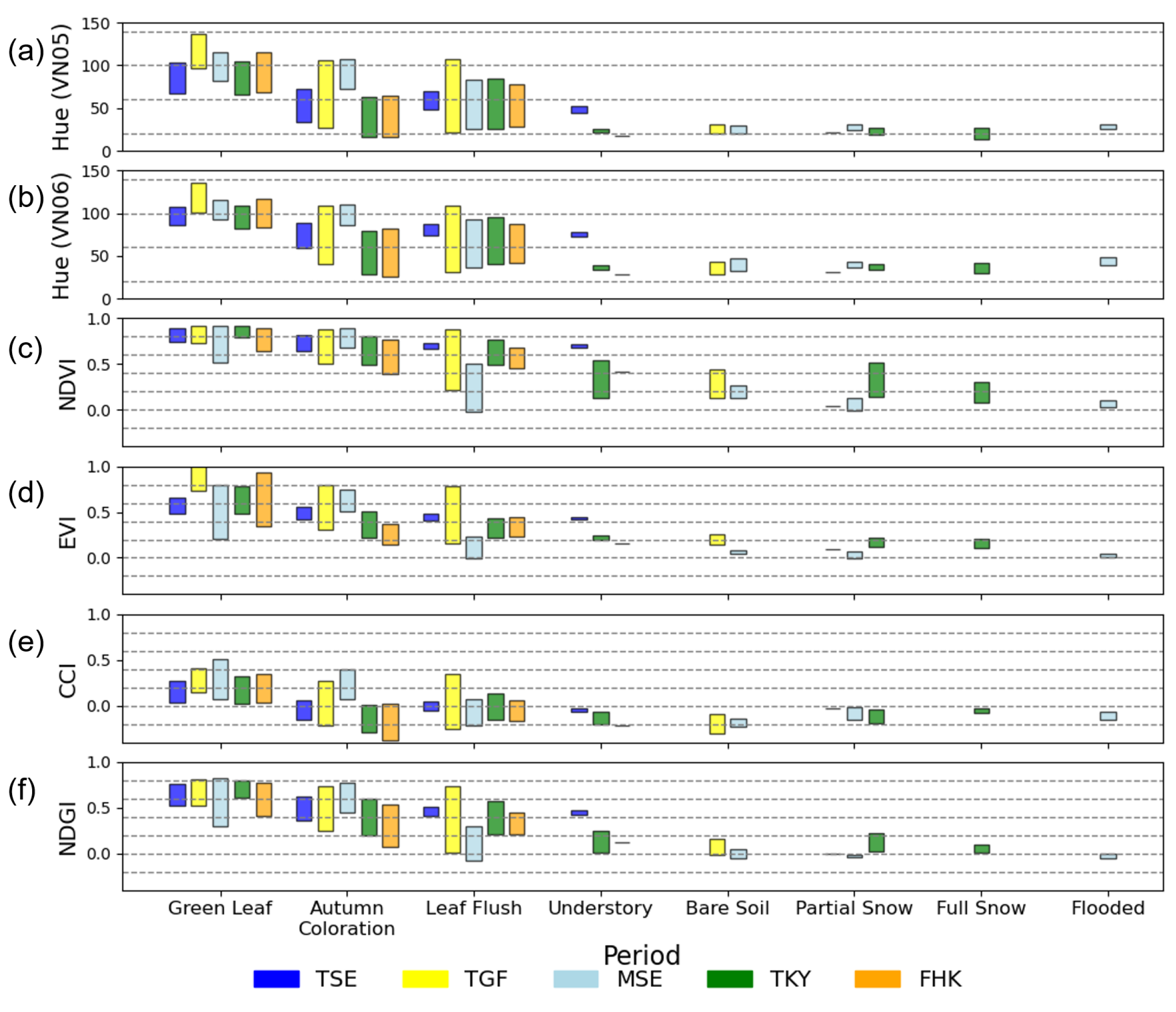 Figure 13. The ranges of spectral indices (a): Hue (VN05), (b): Hue (VN06), (c): NDVI, (d): EVI, (e): CCI, (f): NDGI) for each period and site. These periods are classified based on visual interpretation from ADFC images (Table 3).