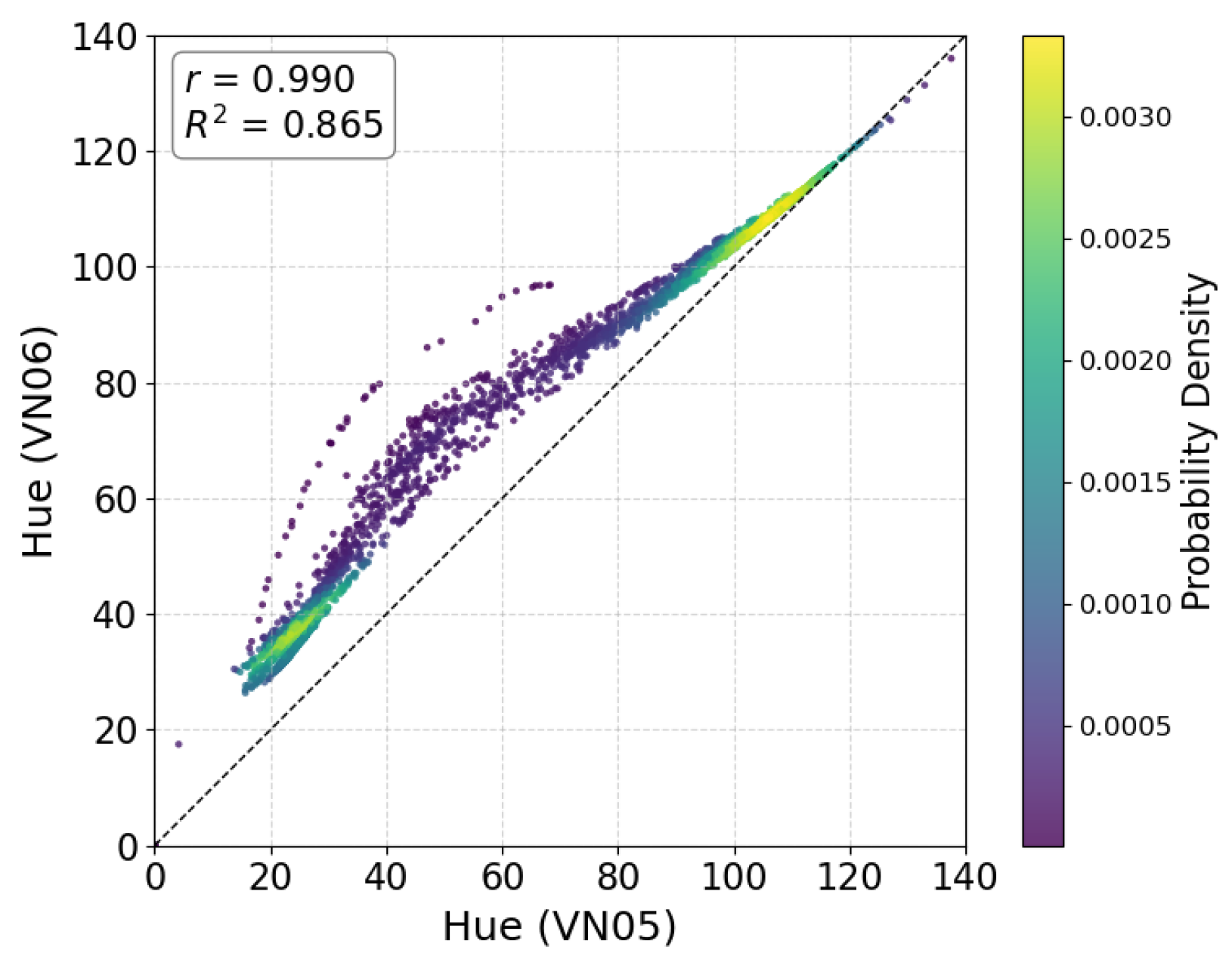 Figure 14. Scatter plots of Hue (VN05: 529.7 nm) versus Hue (VN06: 566.1 nm) across all observation sites ( n = 3890 ). r is the correlation coefficient and R 2 is the coefficient of determination.