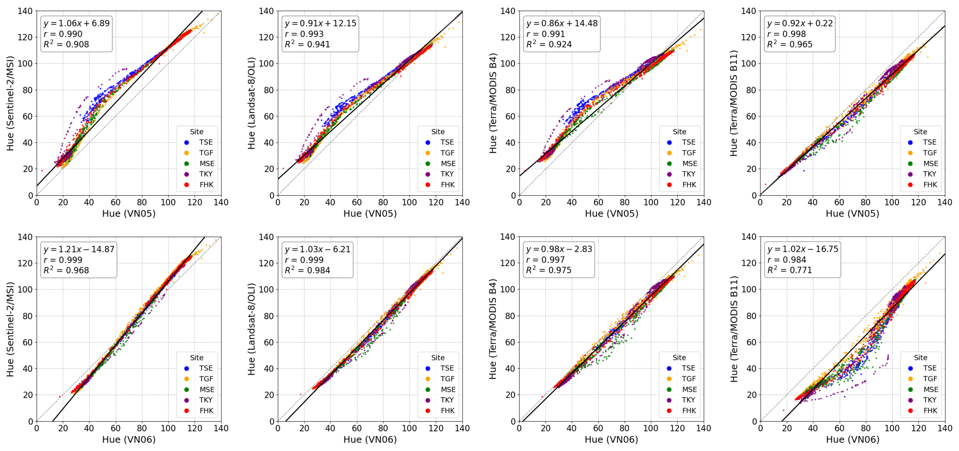 Figure 15. Scatter plots comparing simulated hue values of GCOM-C/SGLI (Hue VN05 and VN06) with those of other satellite sensors: Sentinel-2/MSI, Landsat-8/OLI, and Terra/MODIS. The top row shows comparisons with Hue (VN05), and the bottom row with Hue (VN06). For Terra/MODIS, two green bands were used (Band 4 and Band 11) to calculate hue separately. Each panel includes the regression line (dashed), the identity line (solid), and the regression equation with the correlation coefficient (r) and coefficient of determination ( R 2 ).