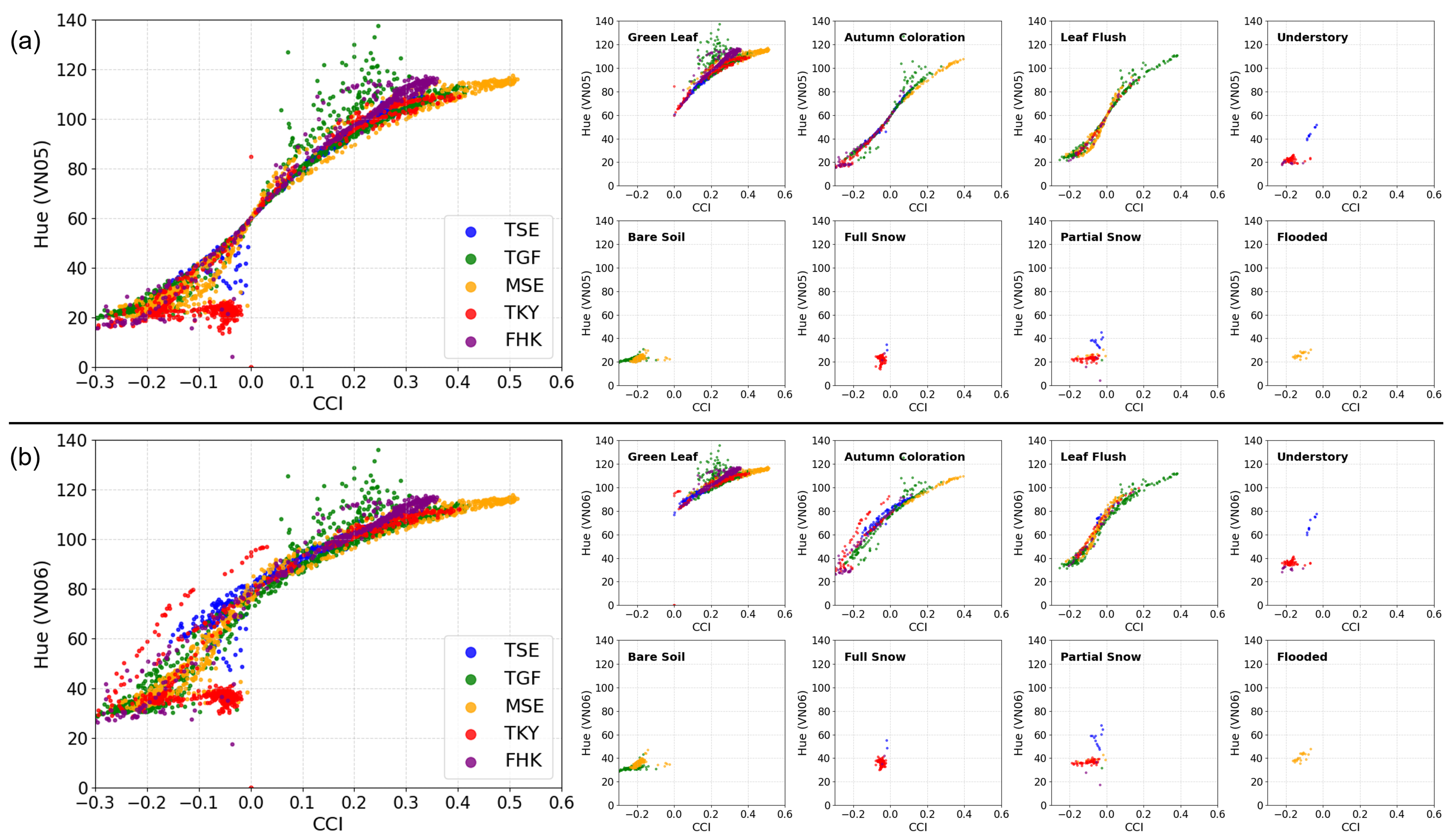 Figure 16. Scatter plots showing the relationship between CCI (Chlorophyll Carotenoid Index) and Hue ((a): VN05, (b): VN06) derived from GCOM-C/SGLI for all observations (left) and for each condition based on visual interpretation (Table 3). CCI was derived from VN05 and VN08 bands of GCOM-C/SGLI.