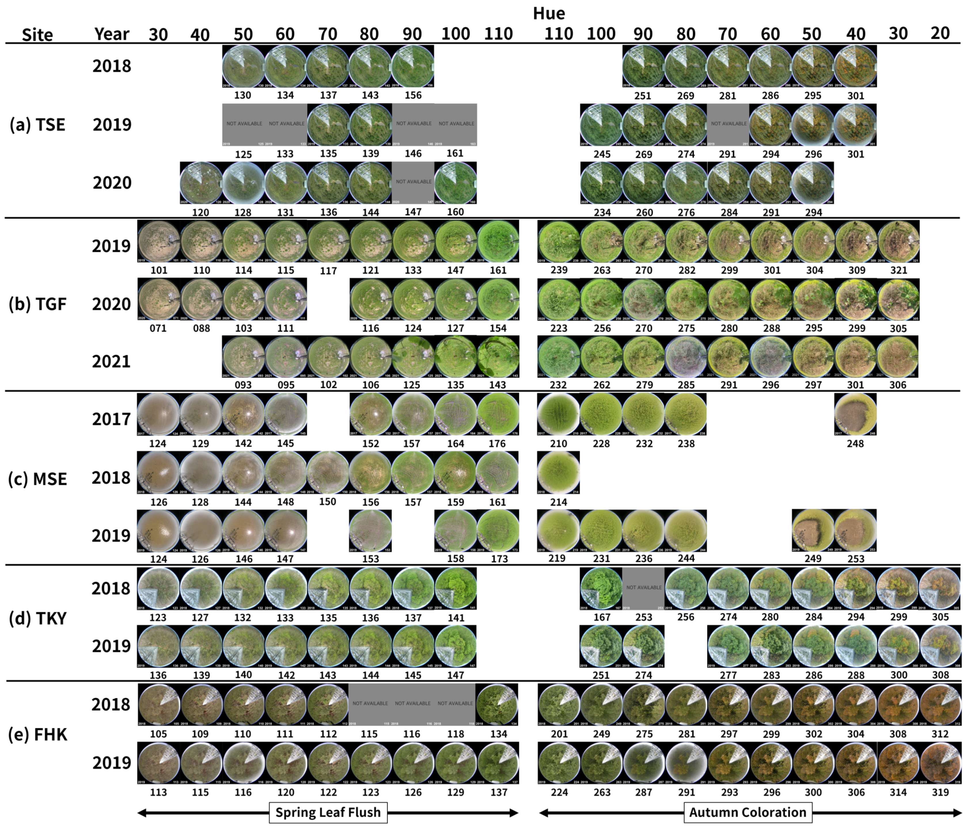 Figure 17. ADFC images when Hue (VN05) exceeded the threshold at each year ((a): TSE, (b): TGF, (c): MSE, (d): TKY, (e): FHK). The left half is the spring leaf flush periods, showing the date (bottom number as “day of year (DOY)”) when each threshold is first exceeded and continues to increase, along with the image for that day. The other half is the autumn coloration periods, showing the date (DOY) when each threshold is first below and continues to decrease, along with the image for that day.