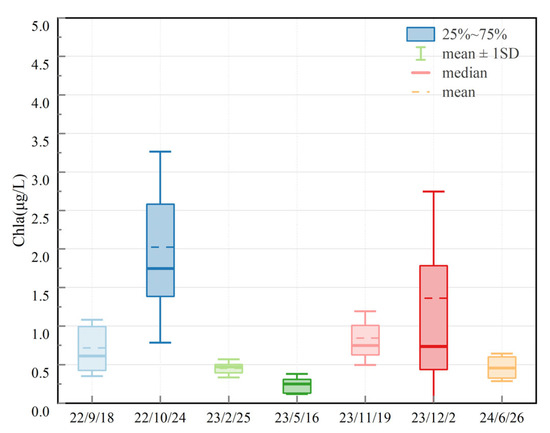 The experimental team also collected in situ water quality data during ASD data acquisition and measured the Chl-a concentration at a depth of approximately 10 cm below the water surface at 127 sampling points using an EXO multi-parameter water quality sonde. Twenty-five measurements were taken at each sampling point, and the average value of all measurements was taken. The EXO water quality sonde measures the Chl-a concentration in a water body using fluorescence photometry and can obtain Chl-a concentration data at a 0.01 μg/L resolution within the range of 0–400 μg/L. The collected Chl-a concentration data is shown in Figure 3.