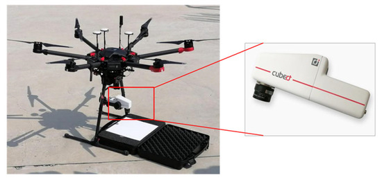 The UAV hyperspectral images for this study were collected using a DJI M600 Pro hexacopter (Made in China) shown in Figure 4 with a 1668 × 1518 × 727 mm payload platform, a maximum speed of 65 km/h, a full-load weight of 6 kg, a recommended flight altitude of no more than 300 m, a maximum pitch angle of 25°, flight endurance of about 15 min, and a maximum wind speed resistance of 8 m/s. The DJI M600 Pro hexacopter is capable of hovering over the water surface for observation and is equipped with a visual positioning system and a forward obstacle detection system.