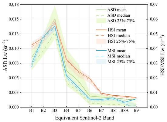 where λ is the wavelength, expressed in nm; is the spectral response of the satellite sensor in this band; is the remote-sensing reflectance of the input data; and R is the calculated equivalent satellite remote-sensing reflectance. The spectral response ranges of ASD and UAV data correspond to 10 bands from B1 to B9 of Sentinel-2B data. The calculated remote-sensing reflectance values of the three types of data are shown in Figure 6.