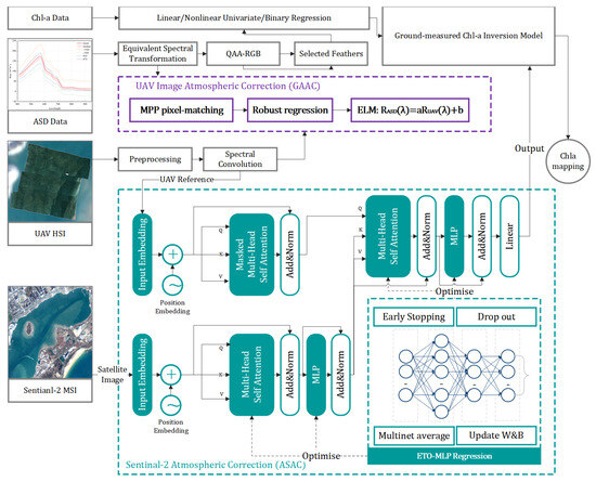 In this study, based on the equivalent remote sensing reflectance derived from three types of remote sensing data, the ASD data were used as the true reference. A Pixel-by-Pixel Matching (MPP) method combined with the Empirical Line Model (ELM) [16,32] was employed to perform ground–aerial atmospheric correction (GAAC) for UAV data. The corrected UAV data then served as the reference for fitting atmospheric correction of Sentinel-2B L1C image in bands B1–B9 using a Transformer-based model, thereby constructing the ASAC. The GASAC results of the satellite imagery were evaluated for accuracy across multiple control groups. The corrected satellite data were subsequently applied to a Chl-a inversion model built from ASD data to map chlorophyll-a concentrations from Sentinel-2 imagery across different experimental dates in the study area. The detailed research workflow is clearly illustrated in Figure 7.