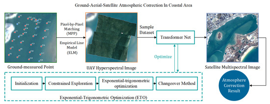 Addressing the challenges of applying GASAC in nearshore waters, this study leverages synchronously collected hyperspectral UAV data as a bridge to establish a stepwise GASAC approach based on a Transformer model calibrated with ASD data for Sentinel-2 imagery. First, a pixel-wise matching method, the Matching Pixel Pool (MPP) [23], is used to match UAV pixels with ASD measurements, enabling empirical ground–aerial atmospheric correction (GAAC). Subsequently, a lightweight Transformer model is designed and optimized via the ETO strategy to achieve high-precision fitting of nonlinear atmospheric effects in nearshore waters, thus realizing aerial–satellite atmospheric correction (ASAC) and constructing a stepwise GASAC model.