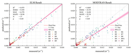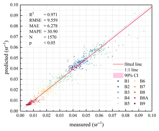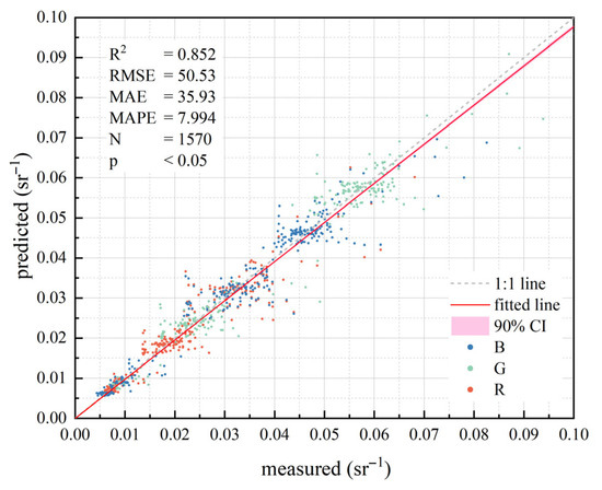 Scatter plot of water-leaving radiance predicted by the ETMNet based on UAV-RGB data.