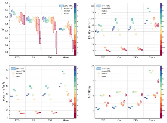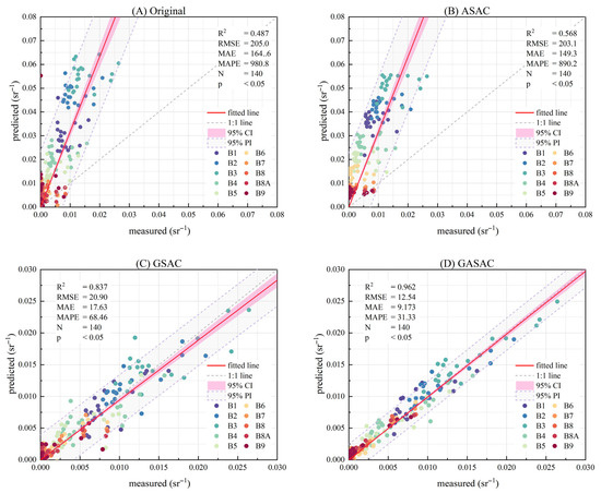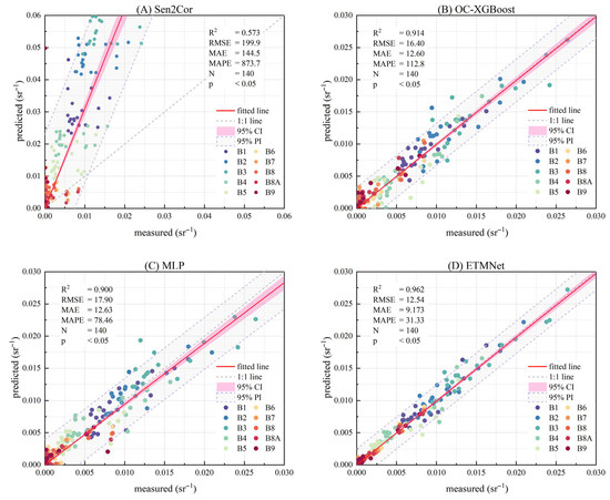 This study designed three control groups to validate the superiority of the proposed GASAC model. Group A utilizes Sentinel-2 Level-2A data, which incorporates atmospheric parameters measured by onboard sensors and applies the Sen2Cor deep learning atmospheric correction model—a widely adopted representative of deep learning-based AC models. Group B adopts the OC-XGBRT algorithm proposed by Song et al. (2023), which combines XGBoost with radiative transfer simulations and represents a state-of-the-art deep learning-based AC approach [19]. Group C employs an MLP architecture identical to the MLP component within ETMNet, used to assess the performance improvement brought by the Transformer architecture. Group D uses the ETMNet model developed in this study. All groups (A–D) utilize the same dataset described in Section 2.4.2. Groups B through D are trained using the ETO optimizer for 100 iterations, with all other settings kept consistent. The comparison results with ASD data are shown in Figure 16.
