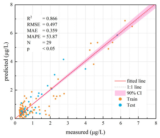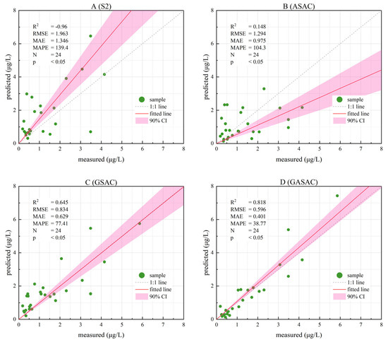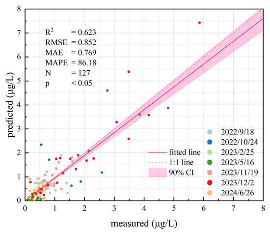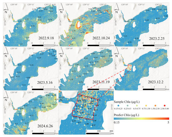 In order to investigate the applicability of the GASAC model to satellite images in other time periods, the resulting images obtained after GASAC of the remote sensing images of the study area during seven experimental periods were processed using Chl-a concentration inversion model, thereby obtaining the spatial distribution of Chl-a concentration in the study area. The predicted and measured scatter of Chl-a concentrations is shown in Figure 17. The points and values in Figure 18 represent the measuring points and the Chl-a concentration values measured at these points, and the colors represent the predicted values obtained after the application of the optimal Chl-a concentration inversion model to the post-GASAC S2 data. All of the seven experiments were conducted under clear-sky and cloudless conditions, and sampling was carried out during noon hours under conditions of good visibility, sufficient illumination, and similar atmospheric environments.