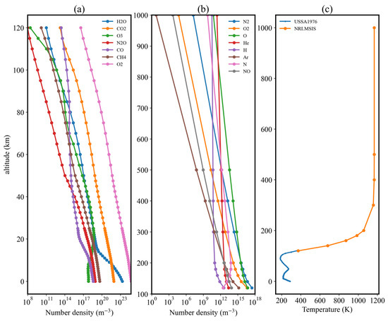 The 50-layer USSA1976 profile and the generated NRLMSIS vertical profile. (a) Altitude-density plot for the seven main gases included in the USSA1976. (b) The same plot for eight gases in the NRLMSIS model. (c) Altitude–temperature plot for the temperature profile compiled using data from spliced USSA1976 and NRLMSIS models. At the splicing point of 120 km, the temperature of the USSA1976 model is 360.0 K and that of the NRLMSIS model is 373.72 K.