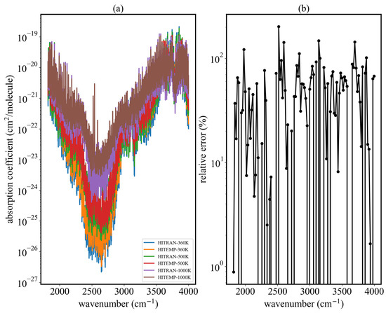 Plot of water vapor absorption coefficients in the range of 1818–4000 cm−1 and their relative error at temperatures above 360 K. Calculations involved the SPECTRA database (https://spectra.iao.ru, accessed on 7 January 2025) with settings as follows: line intensity cut off = 1.0 × 10−28; temperature = 360 K, 500 K, 1000 K; pressure = 1 atm; and Voigt line shape profile, line wing = 50 halfwidths. (a) Absorption coefficients with different databases and temperatures. (b) Relative error of HITRAN and HITEMP at 360 K.