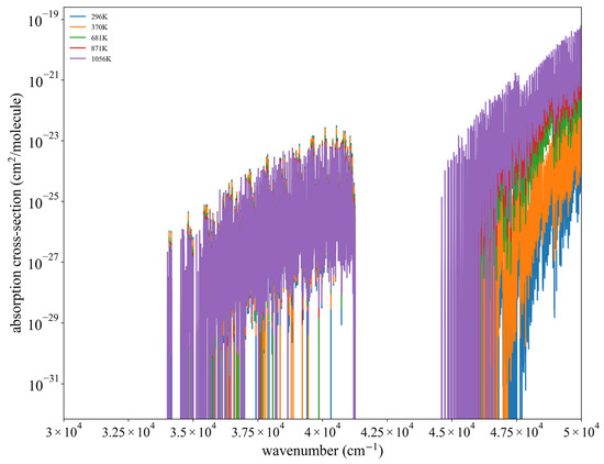 The variation with wavenumber of the oxygen absorption cross-section at specific temperatures. Calculation was based on the collected gas-absorption databases and temperature conditions of the atmospheric profile.