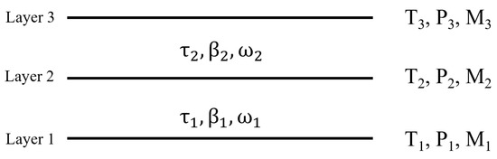 To ensure the accuracy of the model, a phase function was first selected to provide radiative transfer results under various optical-depth conditions, and the results were compared with, and verified against, VLIDORT results. The model was then used for radiative transfer under high-altitude and high-temperature conditions. Rayleigh scattering dominates the radiation emission process there, so only it was considered in practical calculations. Figure 4 illustrates how physical quantities are distributed across each layer during the radiative transfer process. Layer1, Layer2, and Layer3 correspond to the layer numbers of the atmospheric profiles used. Therefore, physical quantities such as temperature, air pressure, and gas concentration are distributed across these layers. The optical depth, extinction coefficient, and single-scattering albedo are calculated from temperature, gas absorption data, and the layer thickness. As a result, they are distributed between each layer. The input of the Monte Carlo model includes some built-in and external parameters. The built-in parameters include the num of photons, the horizontal and vertical boundary values of the simulation space, the distribution of detectors and the height of the observer. The external parameters include the atmospheric profile and the scattering phase function. Once these parameters are determined, the radiative transfer process can be constructed.