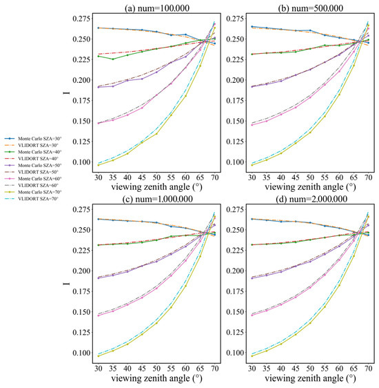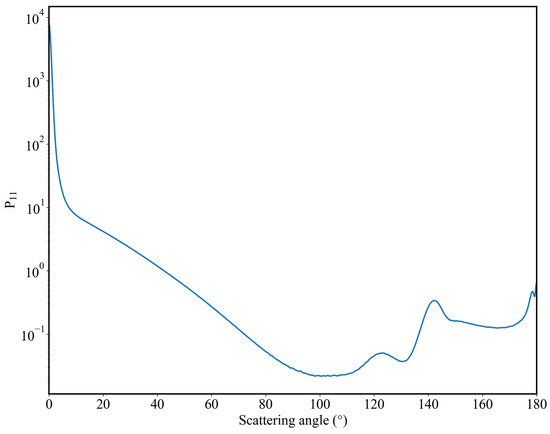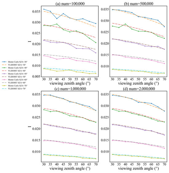 To ensure the accuracy of the Monte Carlo method, the method was going to be validated with the VLIDORT model. The scattering phase function used in the Monte Carlo validation represents the strong scattering process in the radiative transfer calculation as shown in Figure 5. The other optical and geometrical parameter settings were made with reference to actual observation conditions of satellites [46], as shown in Table 3. A three-layer atmospheric profile was used for the comparison with the optical depth in Table 3 representing the sum of all three layers, and the single-scattering albedos in different layers were 0.999. The Monte Carlo model also has unique settings due to the strong effect of the number of photons on the results. When the number of photons increases gradually from tens of thousands to 1 million, the accuracy of the Monte Carlo model improves significantly. However, when the number exceeds 1 million, the accuracy improvement becomes marginal while computational efficiency decreases. More conclusions are discussed in Section 4. For these reasons, in the comparison with VLIDORT, the number of photons in the Monte Carlo model was empirically set to 106.